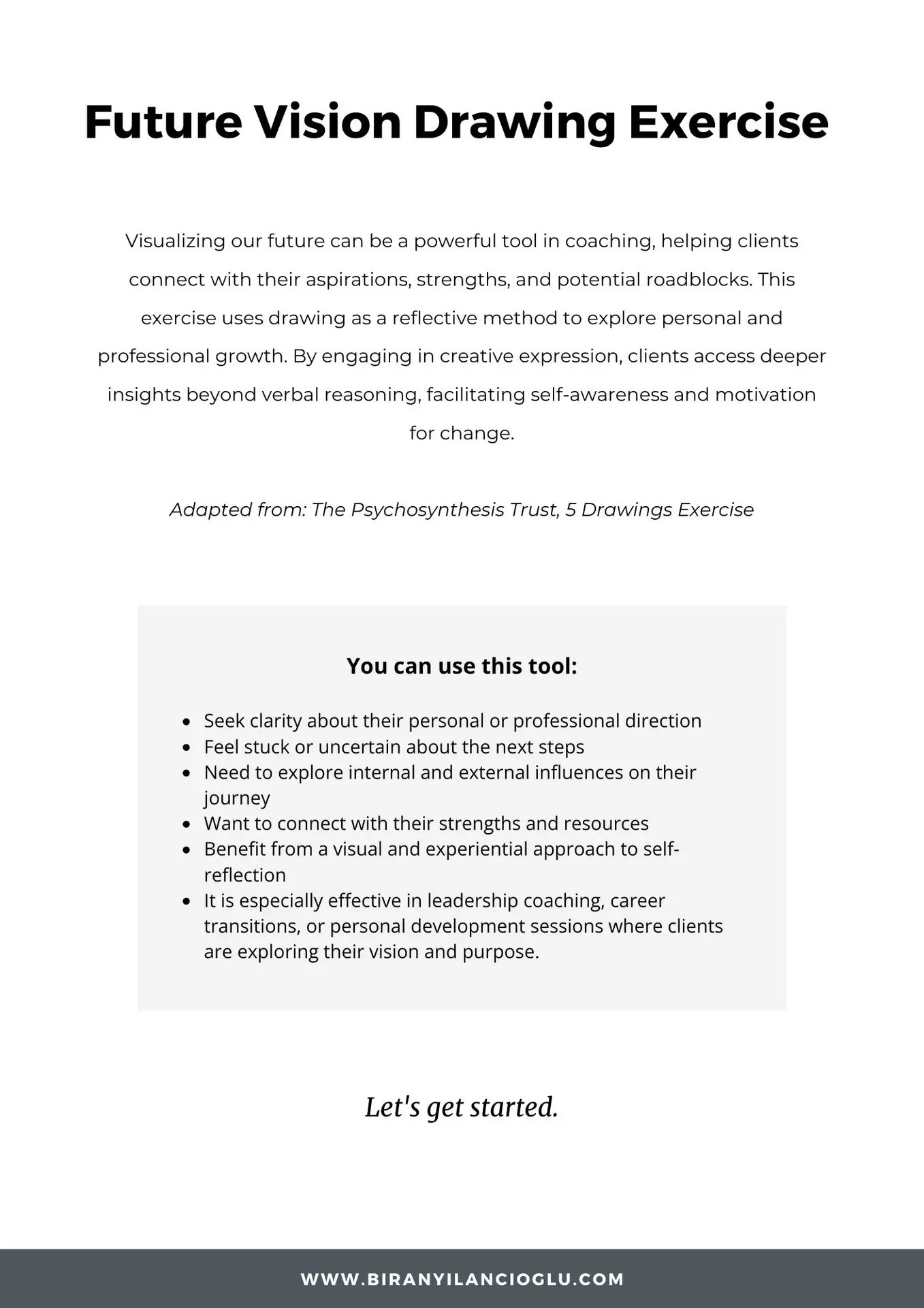 Future Vision Drawing Exercise is a creative, reflective coaching tool that helps clients visualise their future, uncover inner resources, and identify the barriers shaping their personal or professional journey. Instead of relying solely on verbal reasoning, this tool brings a deeper layer of insight through drawing, symbolism, and visual exploration. It is simple to use, powerful in practice, and highly adaptable for leadership coaching, career transitions, and personal development work.